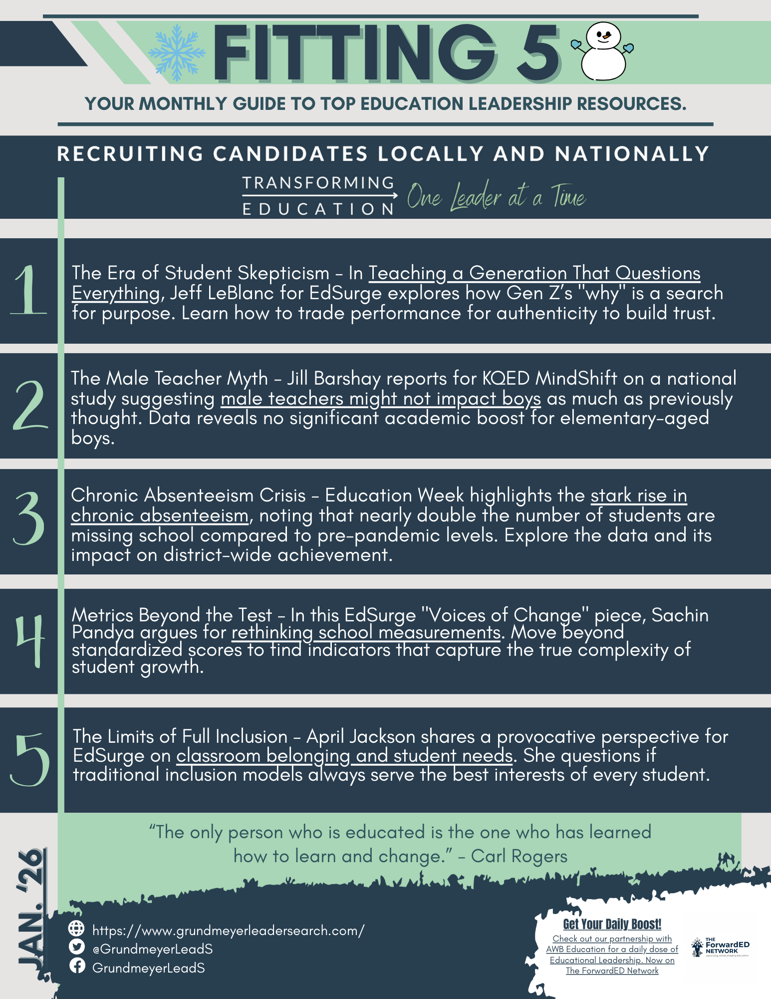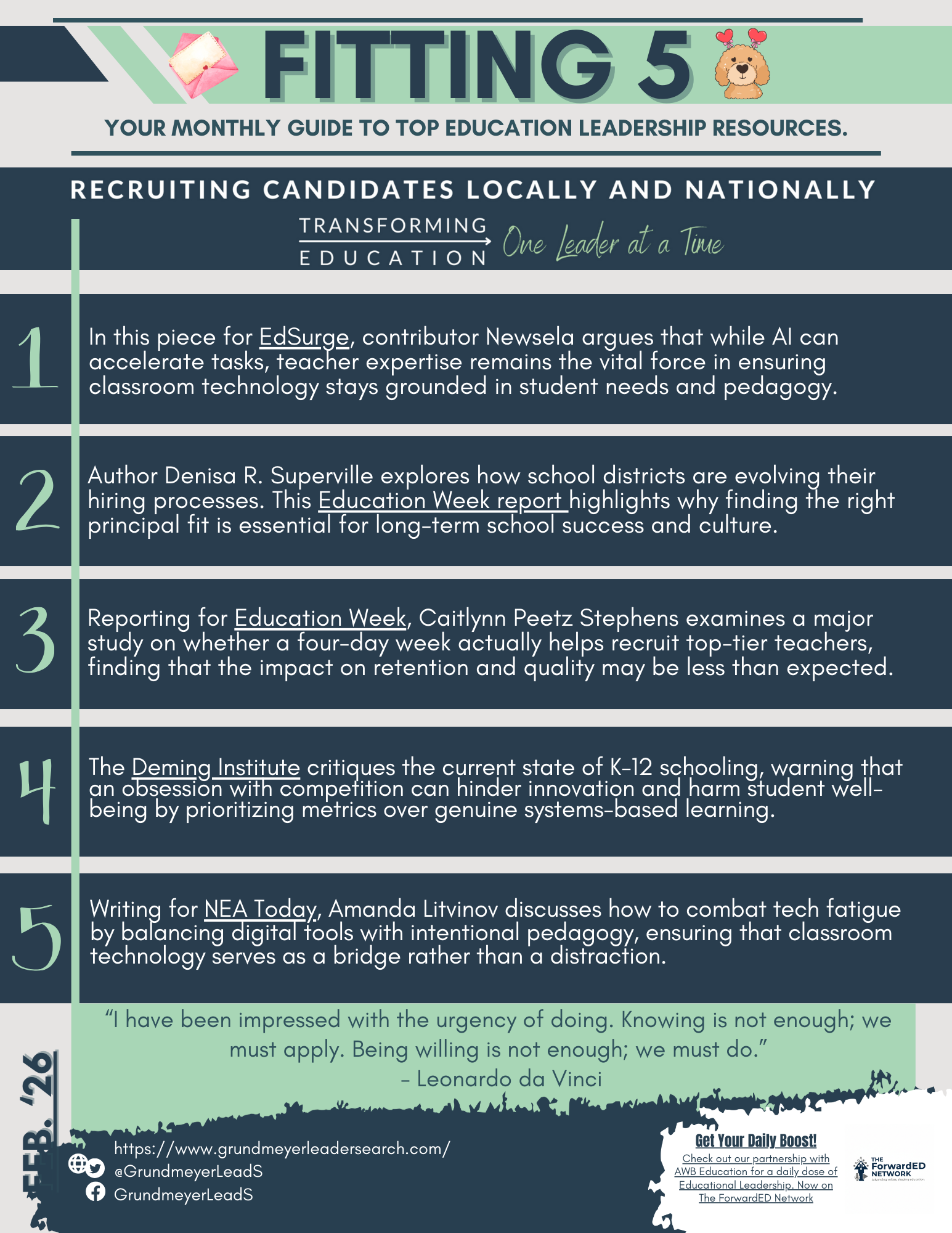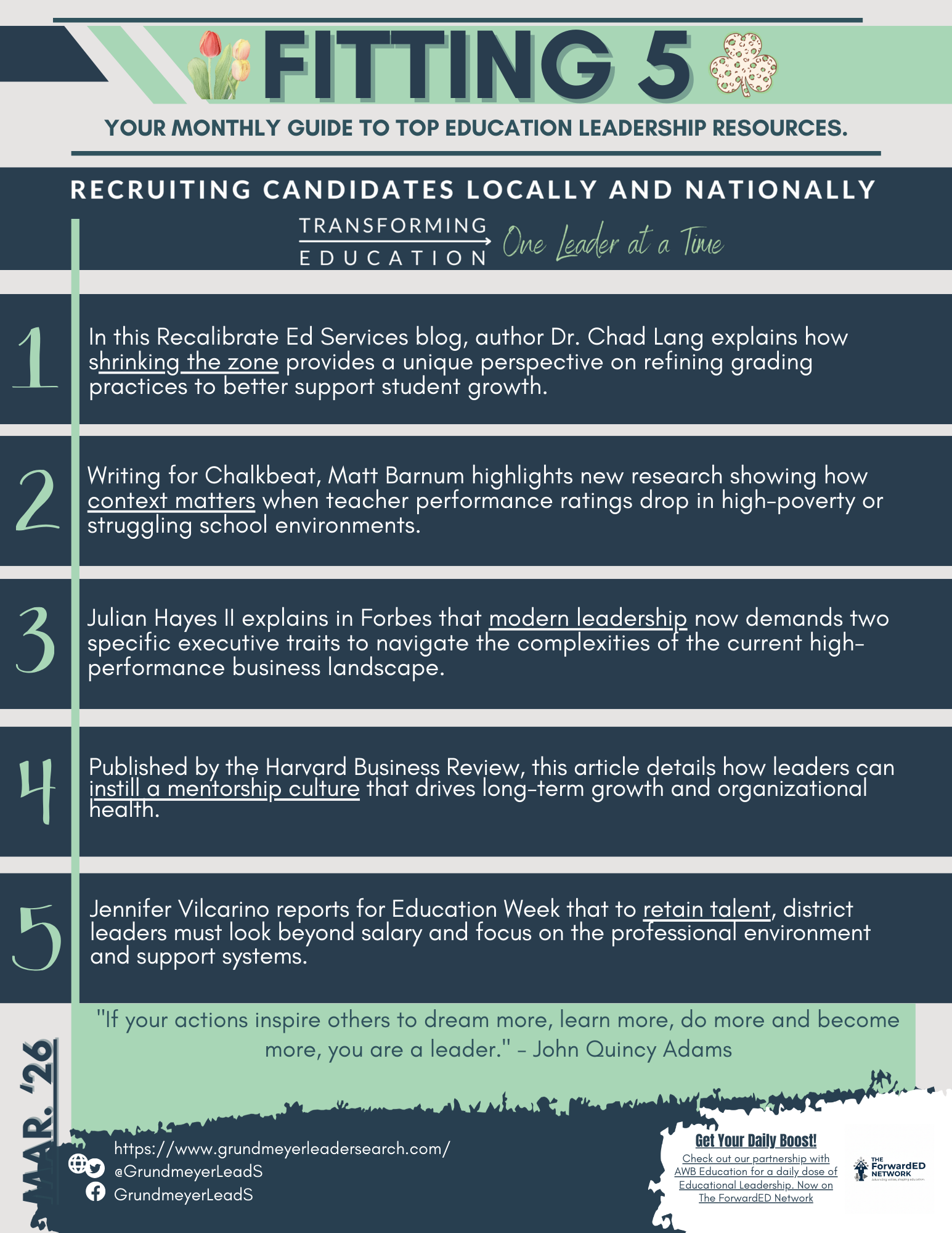 The April '25 Fitting 5 newsletter is your guide to top education leadership resources. This issue features articles on leading effectively, fostering positive leadership, the potential impact of abolishing the DoED, improving teacher morale, and creating dynamic learning environments. Additionally, the newsletter highlights Midwest administrator openings from Grundmeyer Leader Services and their professional development workshops and summer retreats.
