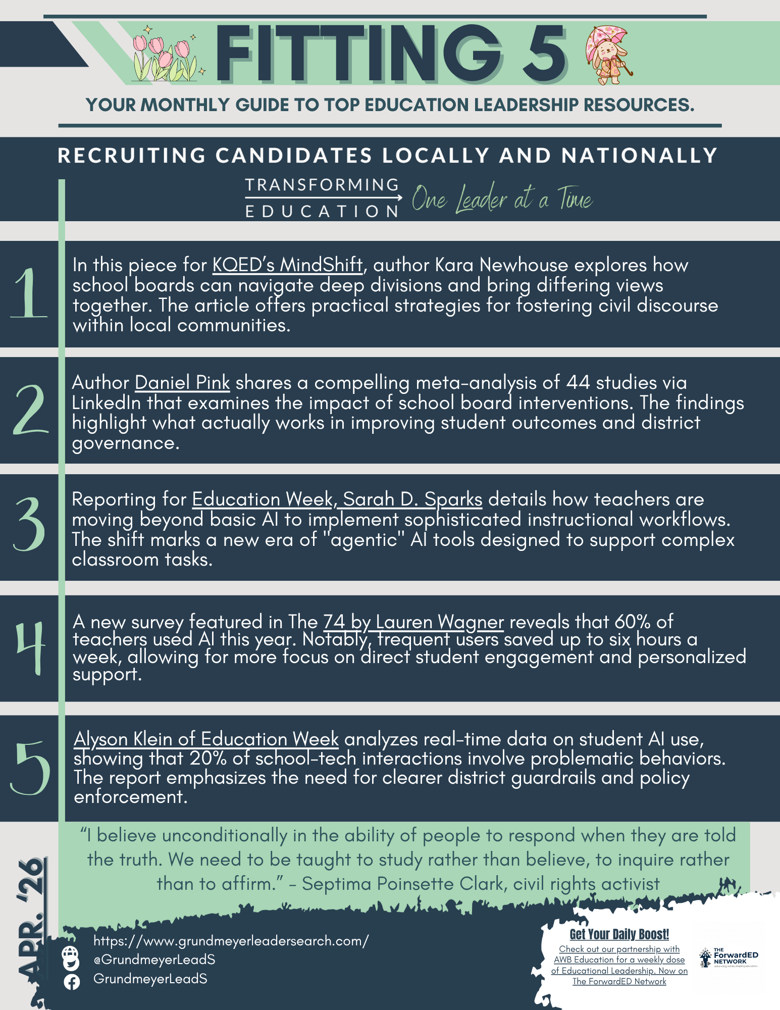 This edition of Fitting 5 explores navigating school board divisions through civil discourse and the measurable impact of board interventions on student outcomes. It highlights the evolution of AI from basic tools to sophisticated instructional workflows that reclaim educator time. Additionally, it features leadership insights on the "kindness of clarity" in communication and introduces specialized AI resources for K-12 administration.